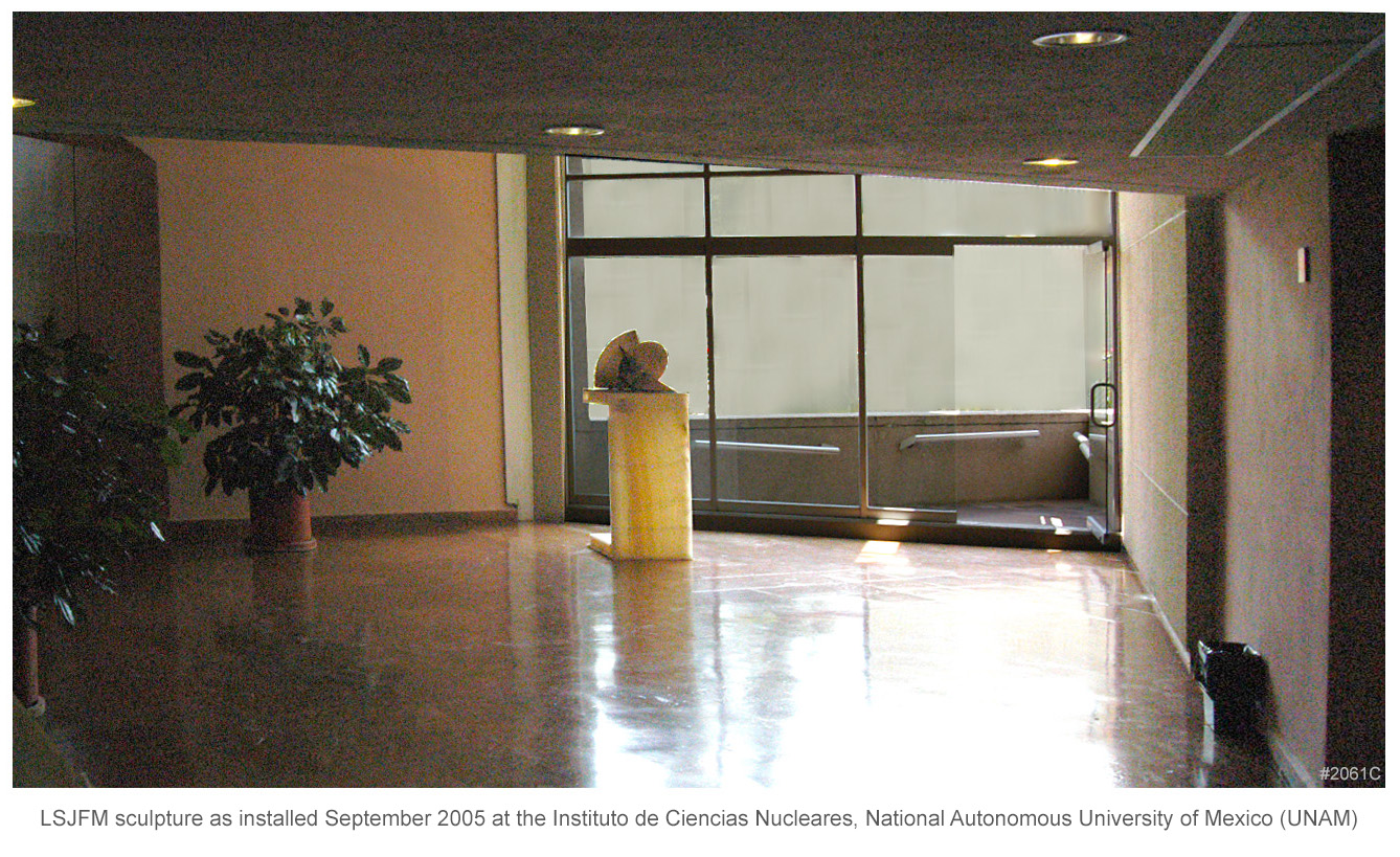 The sculpture is installed at the Institute for Nuclear Studies at the National Autonomous University of Mexico in Mexico City to honor the achievements of Virgilio Beltrán-Lopez. (1932-2000). His thesis research that set limits on diurnal variations in magnetic resonance spectra is famous for showing that inertial mass is anisotropic to within 1 part in 1022. Beltrán then went on to establish an ambitious program of experiments and theory in atomic magnetism, and this, combined with his lasting contributions to science education, made him one of the leading physicists of Mexico.