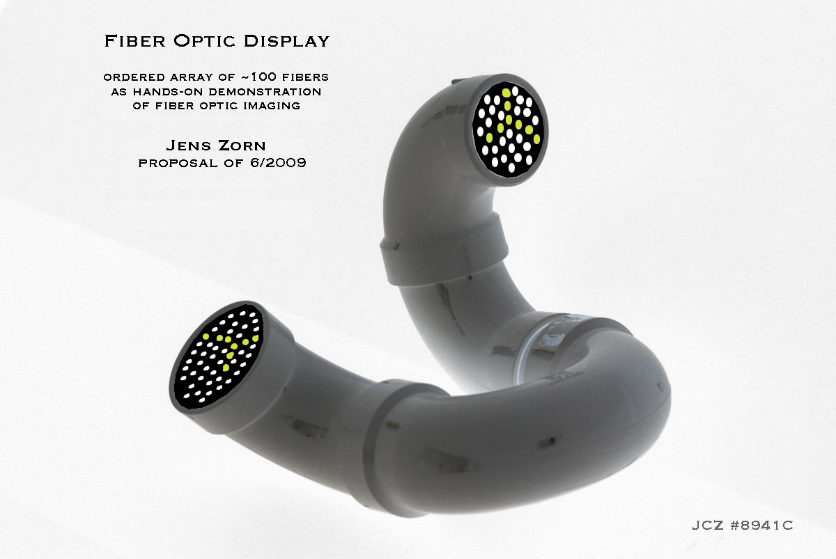 In this, a coherent bundle of several hundred fibers curves through a tubular enclosure made of pipe elbows that might have a diameter of 12″ or so. Ambient light striking one end will provide uniform illumination at the other end, but if a visitor puts their hand on the illuminated end, the image of that hand will appear on the mosaic of the other end.