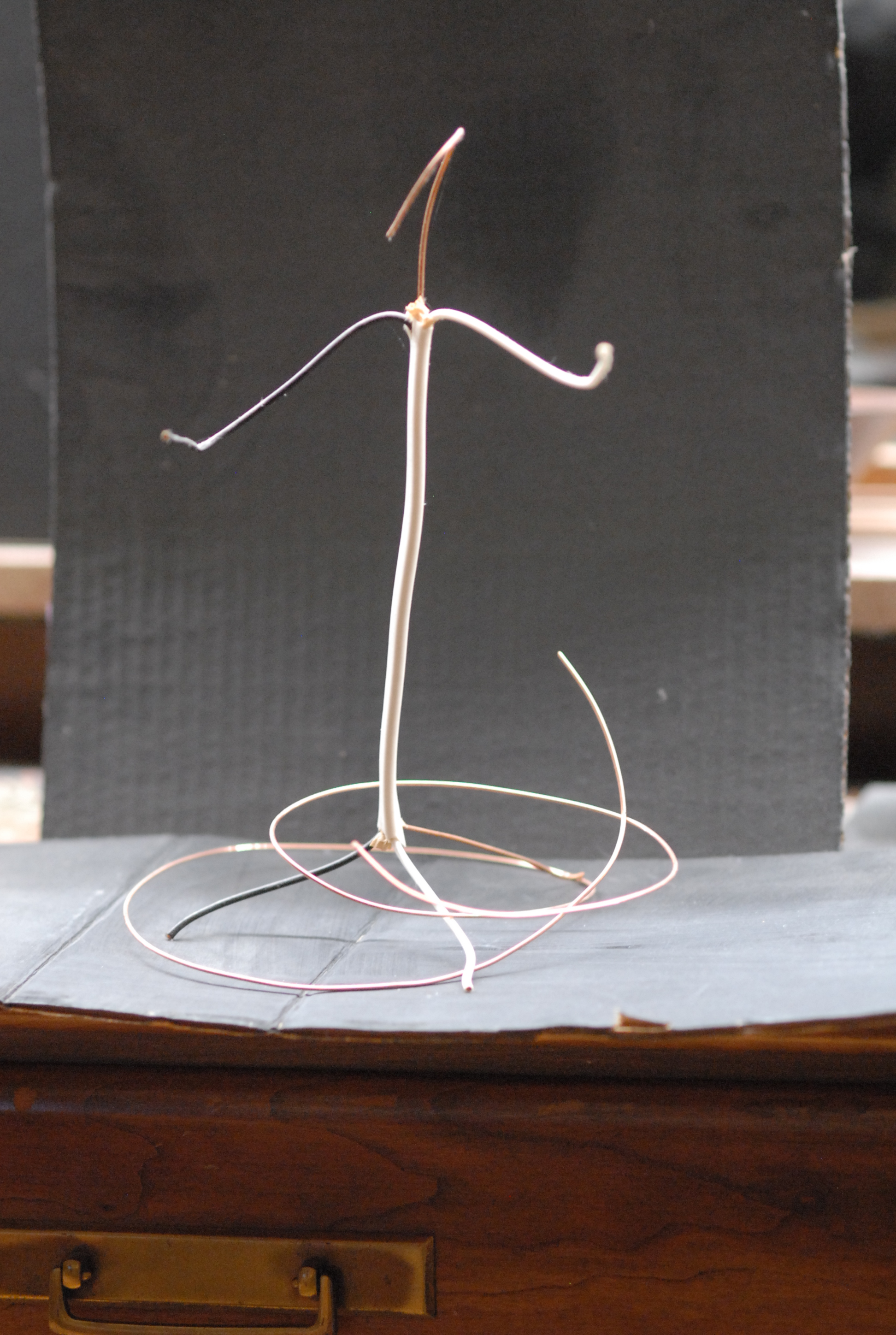 I’ve had fun with forms made from short lengths of Romex Electrical Cable that is commonly used for distributing 110 volt electricity in residences. Romex consists of three copper wires (one bare, a second wire in black insulation, and a third in white) held together in a vinyl tube. One can easily trim the ends of a short length of Romex and get an amusing result: